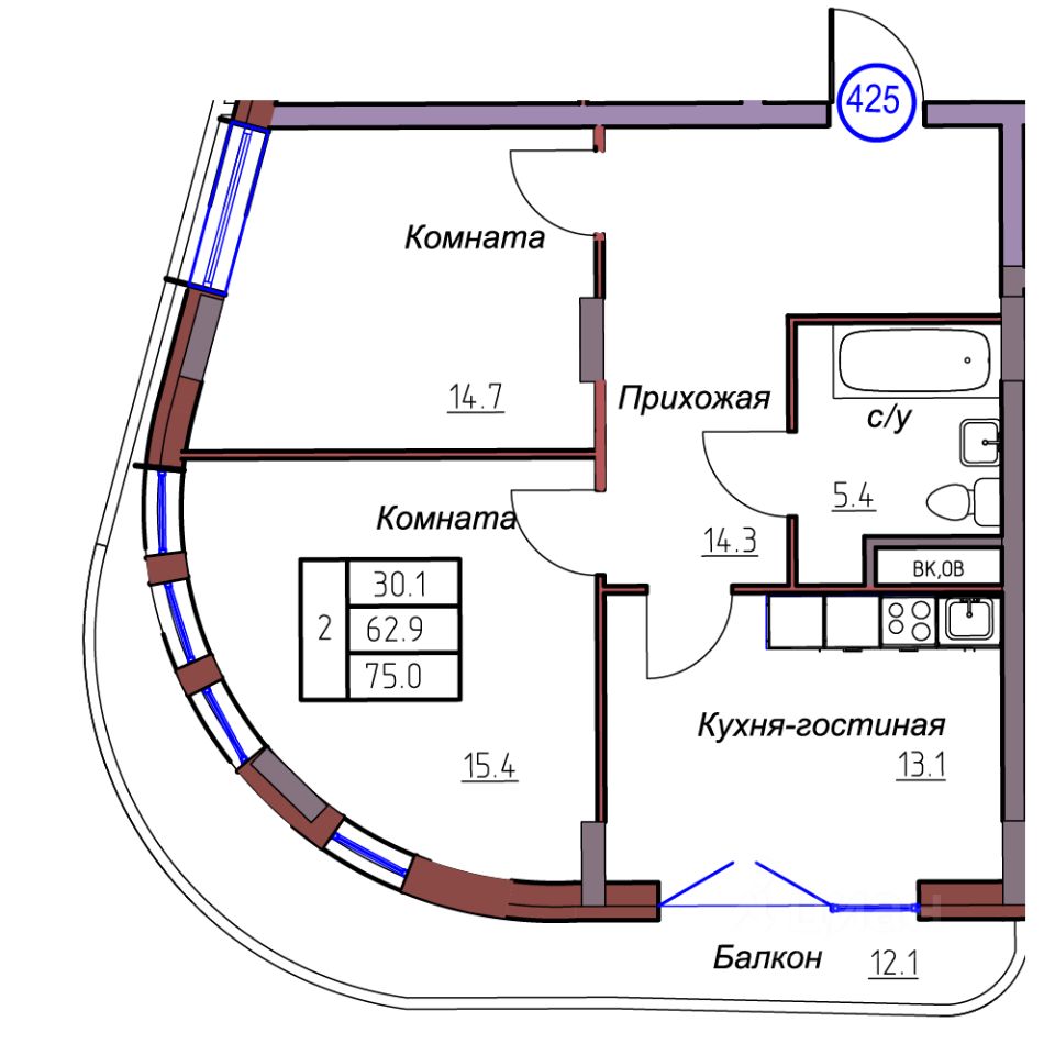 Общая площадь75 м²