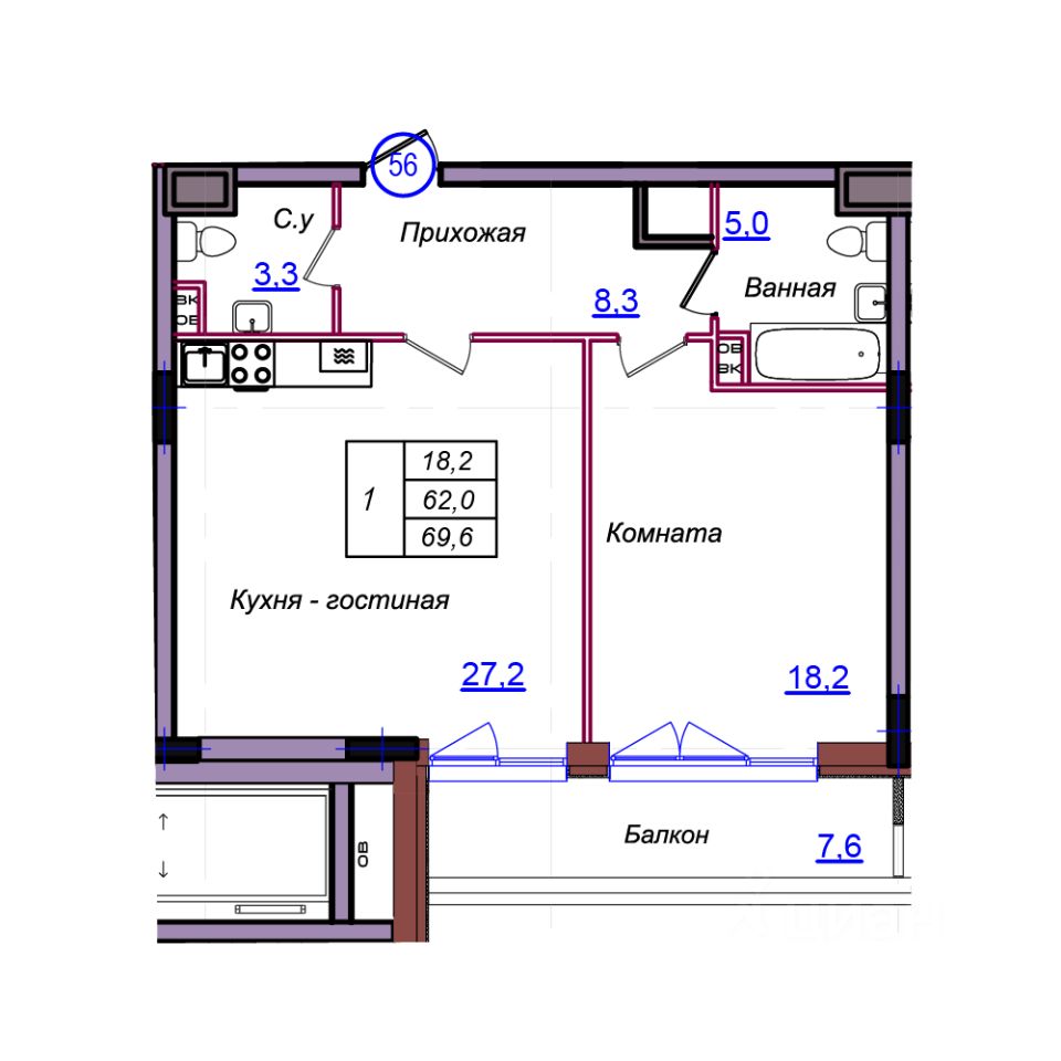 Общая площадь69,6 м²
