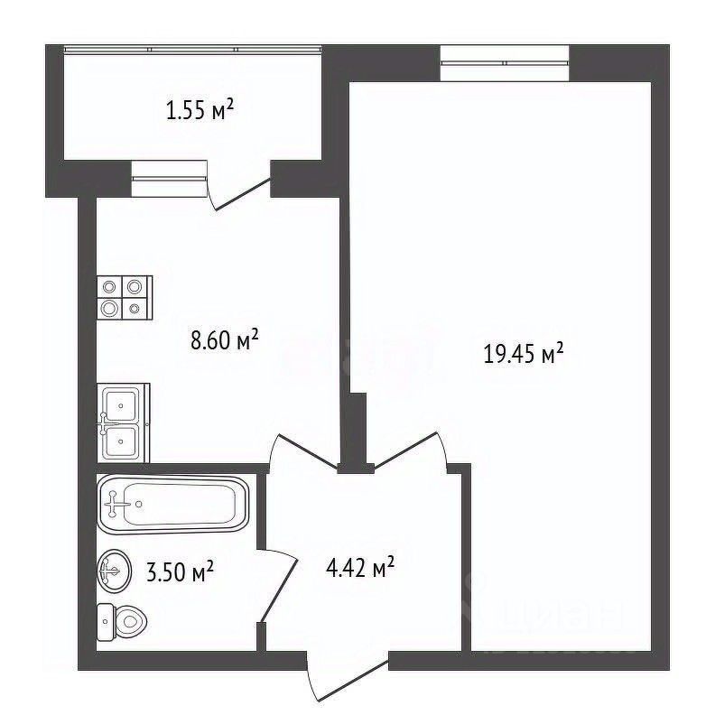 • Кухня: 8.6 м² с выходом на застекленную лоджию (1.5 м²)