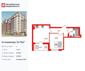 Удобная, классическая, функциональная европланировка, большая кухня-гостиная 13.26 м², просторная прихожая 5.22 м². Общая площадь квартиры - 34.79 м², жилая 10.35 м², высота потолка 2.7 м.