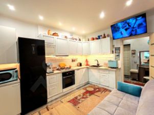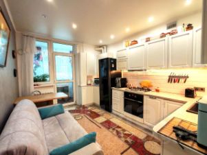 • Кухня: Функциональная кухня (12.4 кв.м) с современным кухонным гарнитуром и выходом на застекленную лоджию (2.2 кв.м), которую можно использовать как мини-кабинет