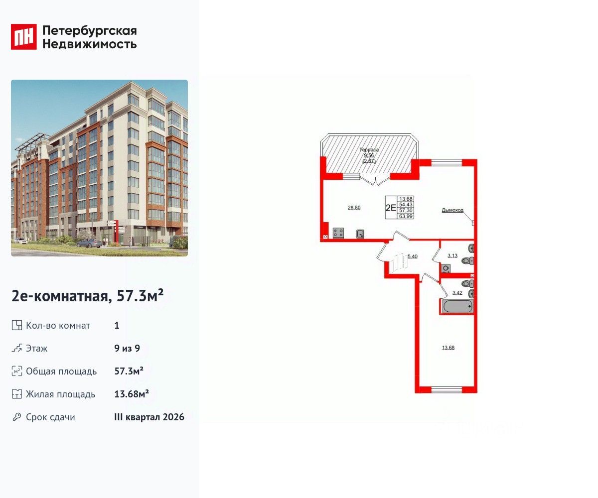 Удобная, классическая, функциональная европланировка, большая кухня-гостиная 28.8 м², просторная прихожая 5.4 м². Общая площадь квартиры - 57.3 м², жилая 13.68 м², высота потолка 3 м.