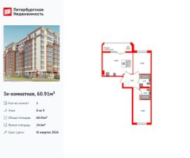 Удобная, классическая, функциональная европланировка, большая кухня-гостиная 19.9 м², вместительная прихожая 6.4 м². Общая площадь квартиры - 60.91 м², жилая 24.6 м², высота потолка 2.7 м.
