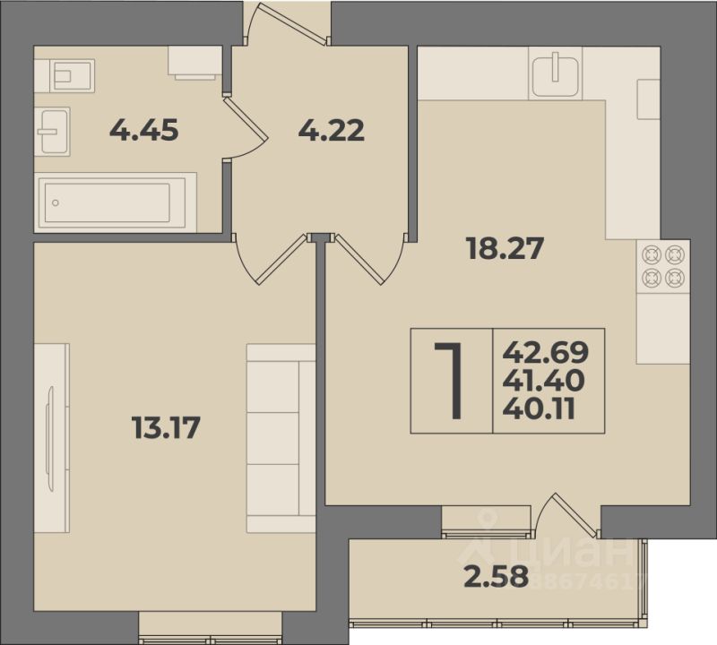 Продаётся 1-комнатная квартира в сданном доме (Дом 3 (1 этап)), срок сдачи: IV-кв. 2025, общей площадью 42.69 кв.м., на 9 этаже. Новый жилой комплекс "Суздальский-3" от Группы компаний "Модуль-Стройград" расположен в Ленинградском районе Калининграда на улице Суздальской.