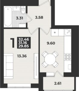 Продаётся 1-комнатная квартира в строящемся доме (Дом 3 (1 этап)), срок сдачи: II-кв. 2026, общей площадью 32.46 кв.м., на 9 этаже. Новый жилой комплекс "11 Мая" от застройщика "ГК Модуль-Стройград" расположен по адресу: г. Калининград, улица Согласия.