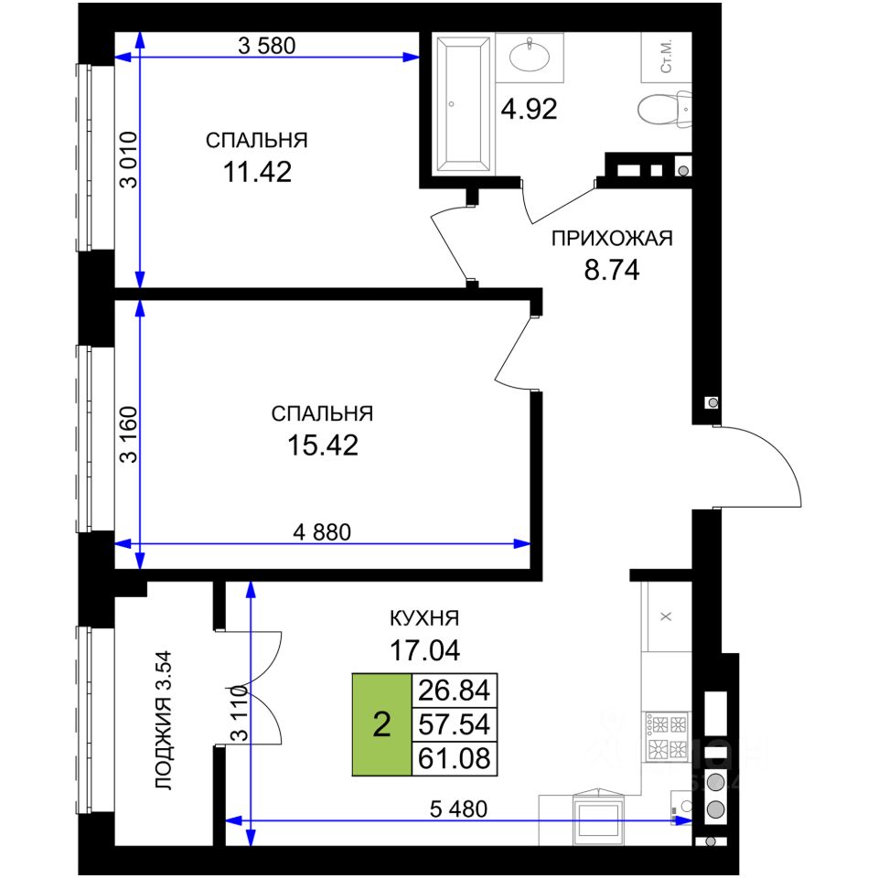Продается 2-комн. квартира, 61,08 м²