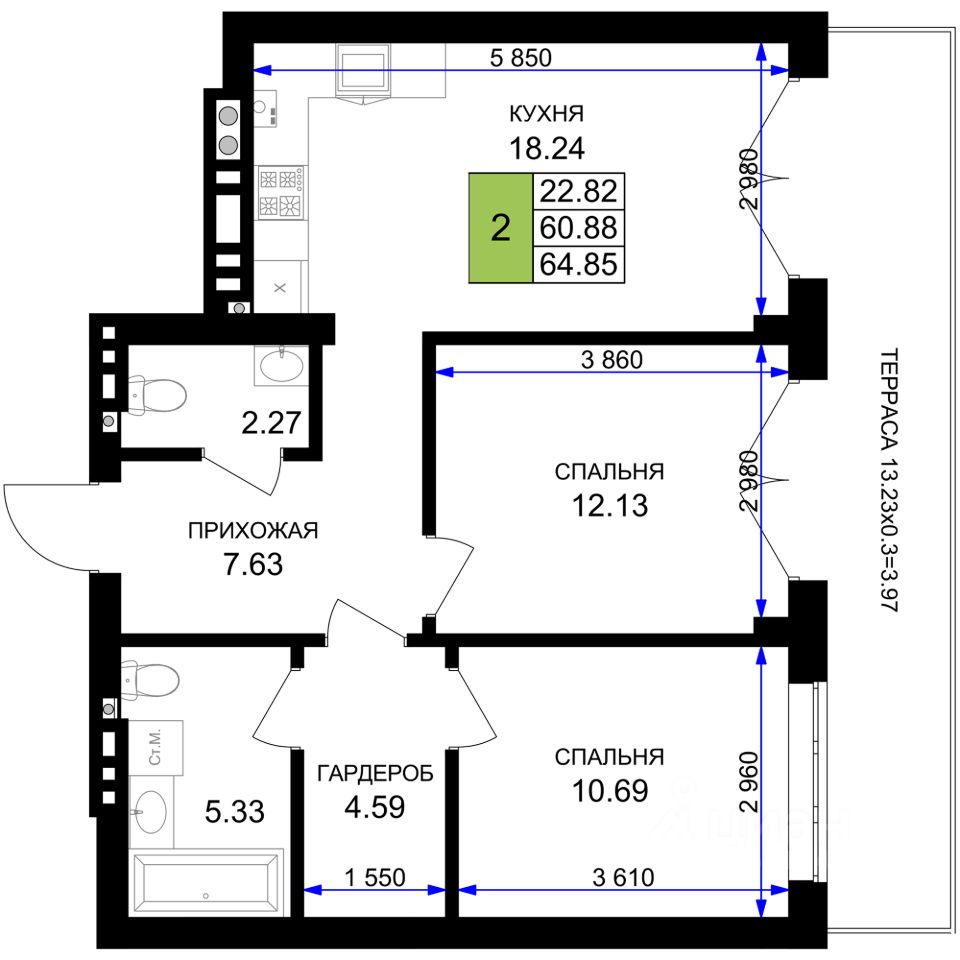 Общая площадь64,85 м²