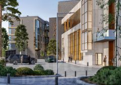 Элегантный дизайн: фасад здания отделан элитными материалами, такими как клинкерная плитка и медные панели, выдерживающие испытание временем.