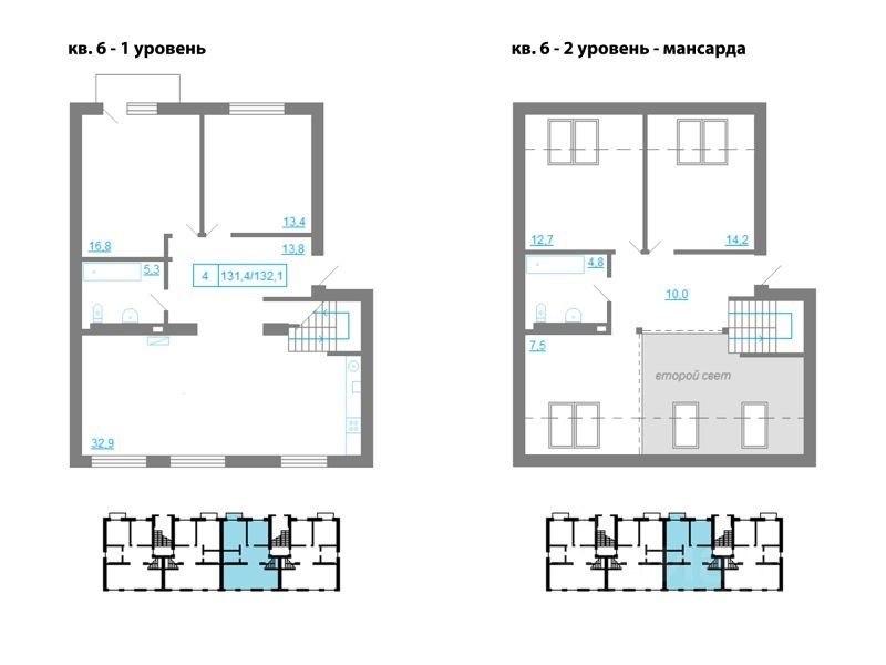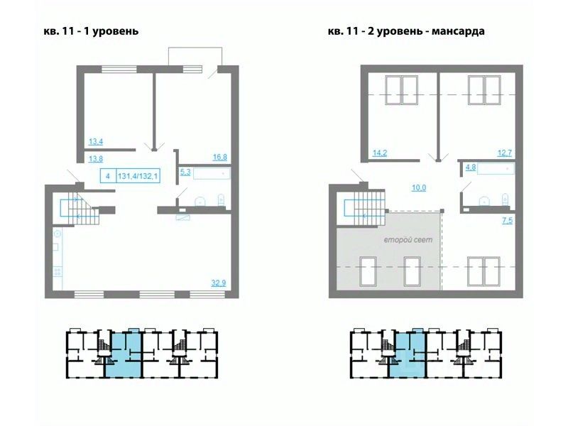 Общая площадь квартиры 147.72 м, жилая 64.9 м (комнаты изолированные) с изящной планировкой, включающей в себя на первом уровне квадратный холл - 13 м, большую кухню-гостиную - 37.8 м2, просторный санузел - 5.3 м2, а также две спальни и балкон.