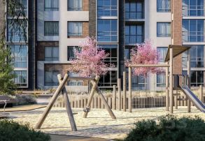 Территория жилого комплекса обустроена с вниманием к деталям: здесь расположены крытые игровые зоны для детей различного возраста и спортивные площадки. Авторский ландшафтный дизайн включает зеленые насаждения, зоны отдыха и прогулочные дорожки, что делает пребывание на территории приятным и комфортным.