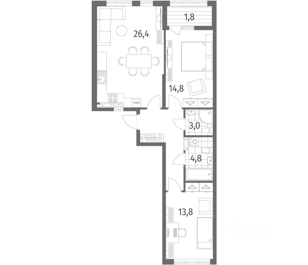 в Дом на Красной от компании ГК "ТРЕСТ". Площадь кухни 26.4 м². Жилой комплекс комфорт-класса "Дом на Красной" расположен в Центральном районе Калининграда на пересечении улиц Красная и Псковская. Жилой комплекс включает в себя два дома высотой 8 этажей. Срок сдачи намечен на 4 квартал 2026 года.