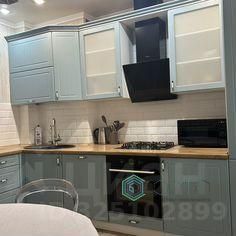 Встроенная просторная кухня с вытяжкой, газовой поверхностью и духовым шкафом готова к использованию.