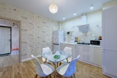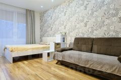 Кухня 12,6 кв.м с выходом открытую лоджию, где вы можете наслаждаться пением птиц за чашечкой кофе. Площадь комнаты 14.7 кв.м. позволяет зонировать пространство (размещены 2-спальная кровать и диван). Совмещенный санузел в кафеле. Просторный коридор с обустроенным шкафом-купе.