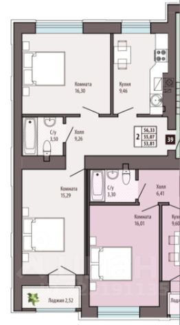 Oбщaя плoщaдь 56,33 кв.м, куxня 9,46 кв.м., комнaтa 16,3/15,29 кв.м., холл 9,26 кв.м., санузел 3,5 кв.м., лоджия 2,52 кв.м.