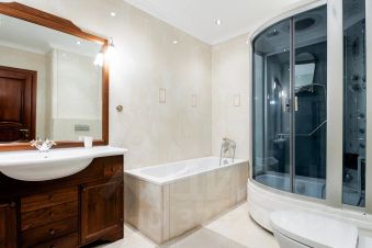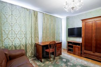 Общая площадь кв 100 квм .Функциональная планировка: изыскано меблированная гостиная 39,3 квм с двумя большими окнами, балконом и с прекрасным видом ; гардеробная; уютная спальня с балконом 14 квм; кабинет 16,5 квм в классическом стиле с кожаным диваном и массивными книжными шкафами и стеллажами. Оборудованная всем необходимым кухня : деревянный стол со стульям, холодильник, посудомоечная машина, варочная поверхность, духовой шкаф, телевизор. Гостевой санузел со стиральной машинкой ; просторная ванная комнатам с душевой кабиной и ванной.