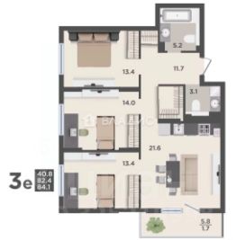 На стадии ремонта, есть возможность увеличить кухню-гостиную с 21,5 м² до 34,8 м², если не понадобится третья комната. Панорамные окна с выходом на широкий балкон 6 м². В планировке можно внести не значительные изменения во входной группе для установки встраиваемого шкафа для верхней одежды. Так же в планировке предусмотрены две гардеробные (2,4; 1,2 м²), ванная комната (5,3 м²) и гостевой санузел (3,1 м²).