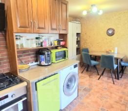 Кухня привлекает внимание своим элегантным оформлением в стильных тёмных тонах цвета пробкового дерева, создавая атмосферу комфорта и уюта. Пол выложен современным керамогранитом, обеспечивающим долговечность и простоту ухода.