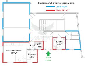 На планировке продаваемая доля выделена красным цветом, доля второго собственника синим.
