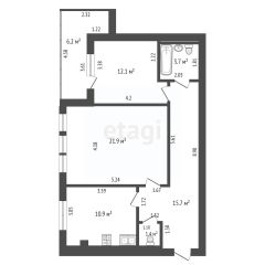 Планировка практичная и комфортная — изолированные комнаты (21 м² и 12 м²), панорамные окна, просторный холл, два санузла (раздельный санузел в прихожей и совмещенный в спальной зоне). Просторная кухня 10.9 м² правильной формы.