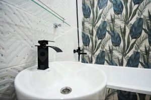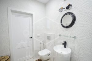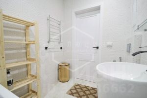 Санитарная техника выполнена в стиле минимализма, подчеркивая функциональность и простоту форм. Умывальник представляет собой глубокую чашу, выполненную из качественного фаянса, над которой висит зеркало в толстой металлической раме. Ванна установлена у акцентной стены, которая придает помещению дополнительный объем. Такой интерьер вызывает чувство спокойствия и умиротворённости, превращая повседневную гигиену в приятны