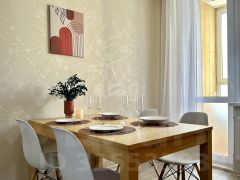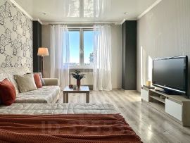 Общая площадь 62.2 кв.м., просторные комнаты 18.7 и 15 кв.м. Полностью оборудована детская с уютной кроватью, спортивной стенкой, рабочим местом школьника, шкафом. В гостиной огромный семейный диван с удобным ортопедическим матрасом.