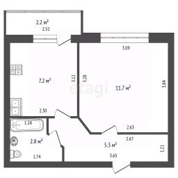 Общая площадь квартиры составляет 30 кв.м (остекленная утепленная лоджия 2,2 кв.м, с хорошим видом на будущий парк и церковь) : кухня —7,2 кв.м; комната — 11,7 кв.м; совмещенный санузел — 2,8 кв.м; * коридор — 5,3 кв.м в котором размещена удобная большая гардеробная.