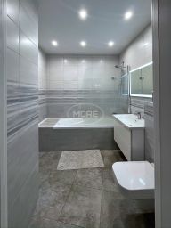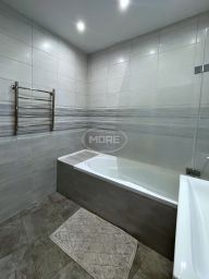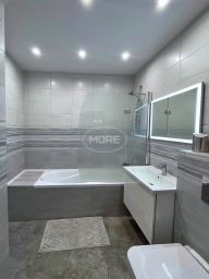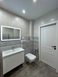 в совмещенном сан.узле акриловая ванна с душем, навесной шкаф с раковиной, унитаз с инсталляцией и гигиеническим душем. Второй сан.узел без сантехники, но сделаны все выводы