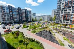с наземными парковками, автоматами с артезианской водой, качелями, горками, песочницами, уличными тренажерами, полем для спортивных игр, велодорожками, газонами, цветочными клумбами и ландшафтным озеленением.