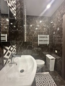 Просторный совместный санузел, где помещается вся необходимая сантехника, включая глубокую ванну и стиральную машинку.