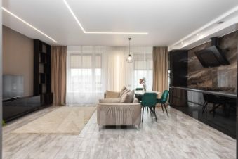 просторная кухня-гостиная 29,2 кв.м. в приятных тонах, Полы с подогревом. Варочная поверхность, духовой шкаф и посудомоечная машина фирмы Bosh