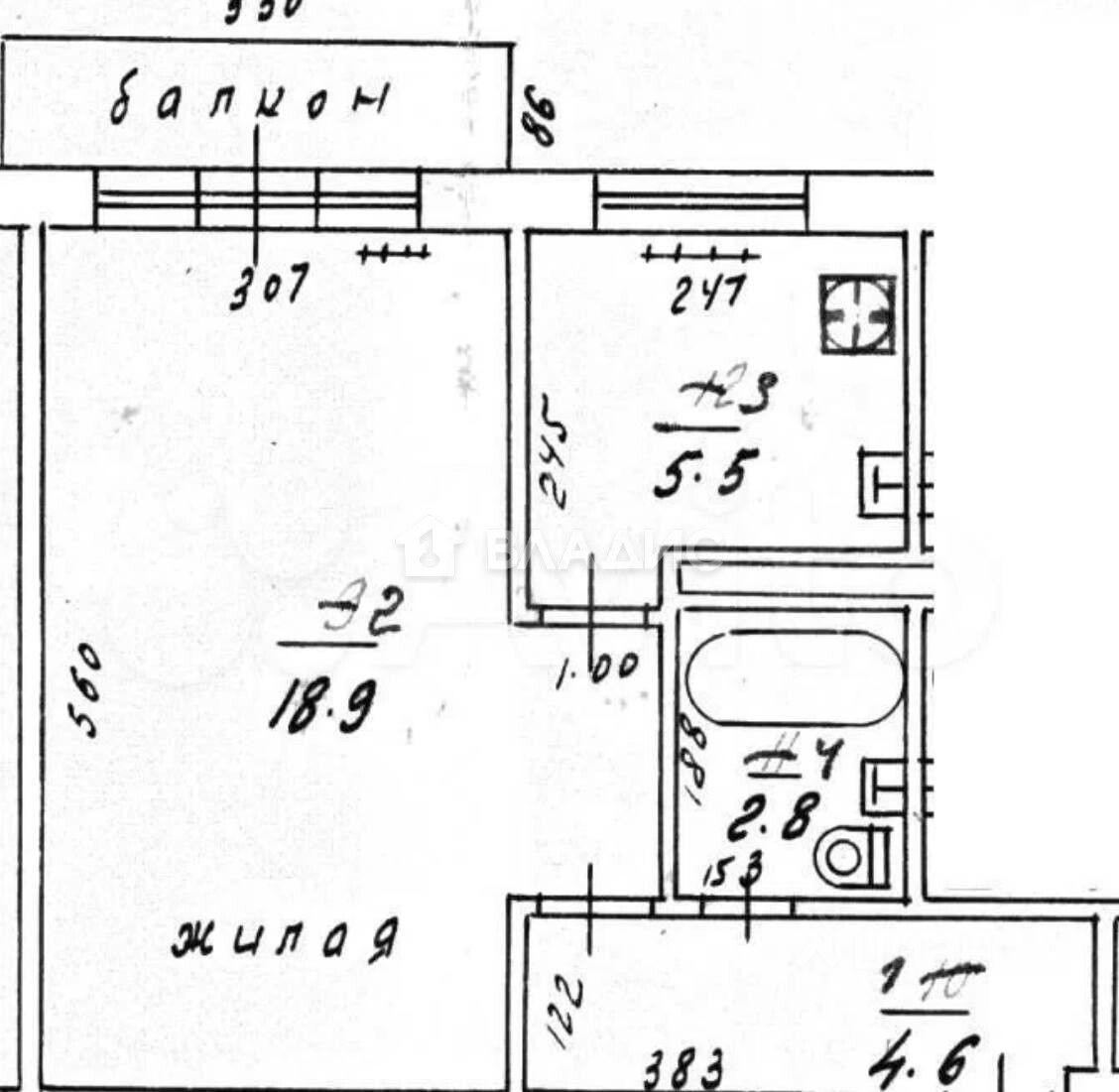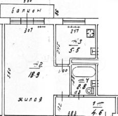 Общая площадь квартиры: 31.8 кв.м, площадь комнаты 18 кв.м, площадь кухни 5.5 кв.м.