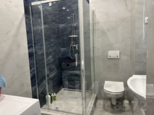 -Ванная комната с современным ремонтом; душевая кабина, зеркало с подсветкой, стиральная машина.