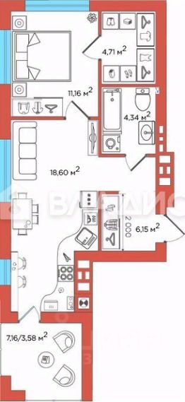 Квартира имеет евроремонт, комфортное пространство и удобное расположение, а просторная площадь квартиры позволяет комфортно разместить мебель и предметы интерьера. Общая площадь квартиры составляет 48,5 кв. м, из которых 11,16 кв. м приходится на жилую площадь, плюс в комнате находится гардеробная 4,71 м.кв, где можно разместить все вещи. Высота потолков 2,7 м создаёт ощущение простора.