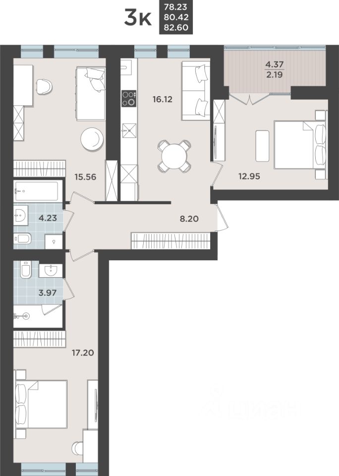 Продаётся 3-комнатная квартира в строящемся доме (Дом 2 очередь 8), срок сдачи: IV-кв. 2026, общей площадью 80.42 кв.м., на 1 этаже. Жилой квартал "Невский парк" - один из самых зеленых жилых кварталов Калининграда.