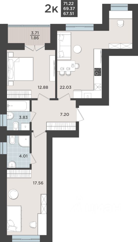 Продаётся 2-комнатная квартира в строящемся доме (Дом 1 очередь 8), срок сдачи: IV-кв. 2026, общей площадью 69.37 кв.м., на 2 этаже. Жилой квартал "Невский парк" - один из самых зеленых жилых кварталов Калининграда.