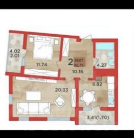Общая площадь квартиры 63,2 кв.м.,