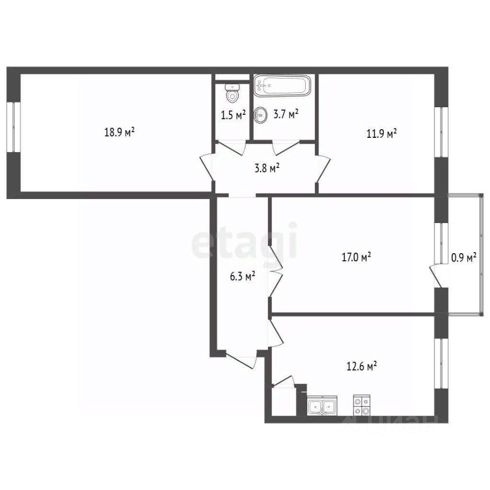 • Кухня-столовая 12.6 м²: просторная зона для семейных ужинов.