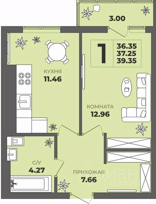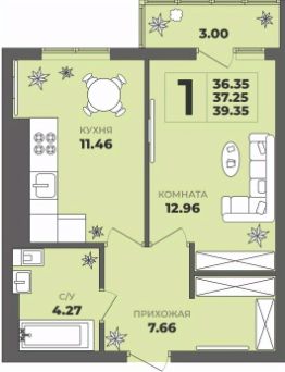 Общая площадь37,25 м²