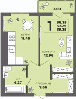 Продаётся 1-комнатная квартира в строящемся доме (Дом 2), срок сдачи: II-кв. 2027, общей площадью 37.25 кв.м., на 7 этаже. ЖК "ГРИНВУД".