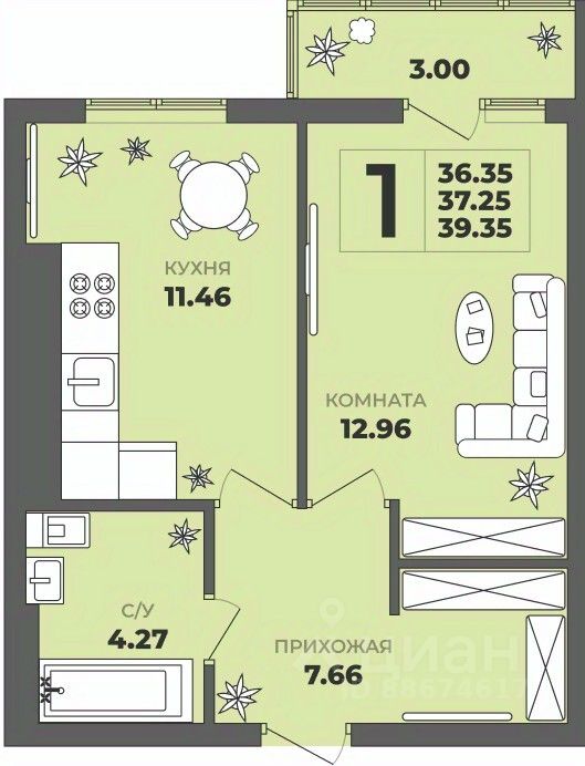 Общая площадь37,25 м²