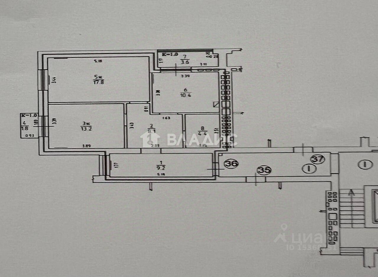 Общая площадь квартиры: 63.1 кв.м, площадь комнат (13.2/17.8), площадь кухни 10.4 кв.м. Кухня объединена с коридором и частью комнаты с выходом на лоджию, часть площади выделена под гардеробную.