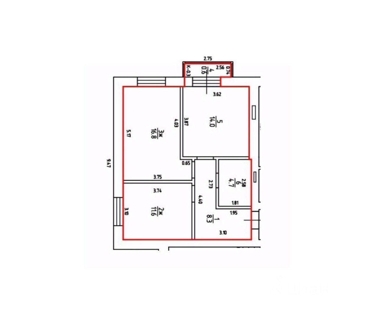 Площадь балкона - 0.6 кв.м