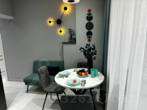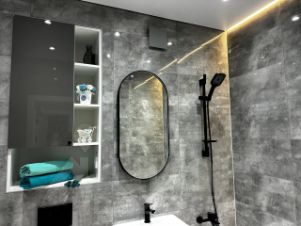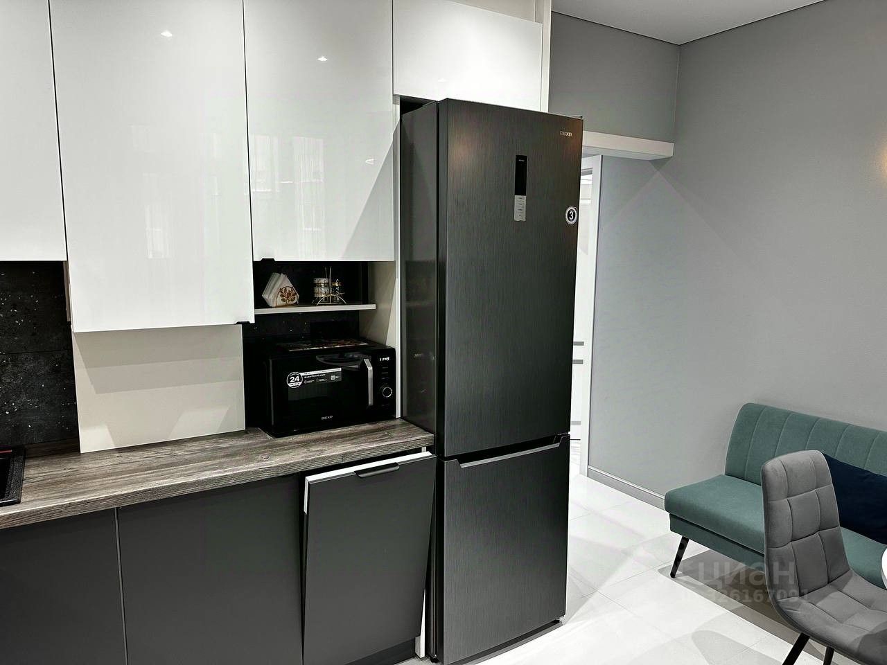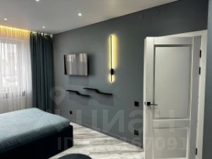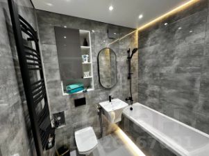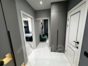 В квартире современная отделка в серо-белой гамме: просторный коридор со встроенными шкафами до потолка и наливным полом, спальня с большой кроватью, удобным диваном, плотными шторами и потолочной подсветкой. Ванная в крупноформатной серой плитке: ванна, душевая система, полотенцесушитель, LED-подсветка зеркал и ниши для хранения. Всё готово к заселению.