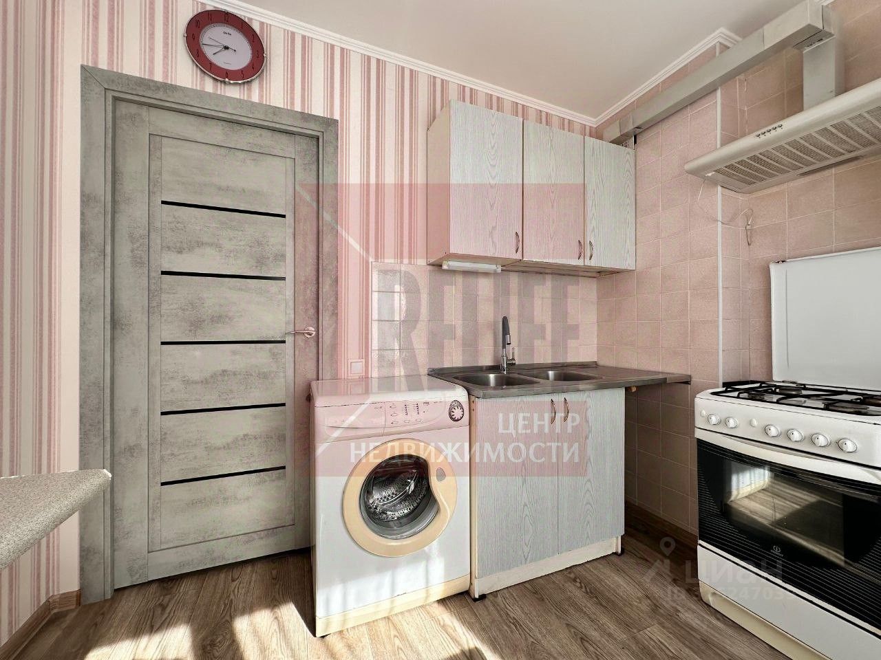 На кухне (8,7 м²) остаётся гарнитур, плита, холодильник, стиральная машина и стол.
