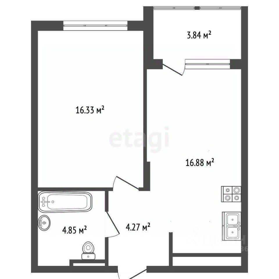 Кухня гостиная 16,88м2, спальная комната 16,33м2.