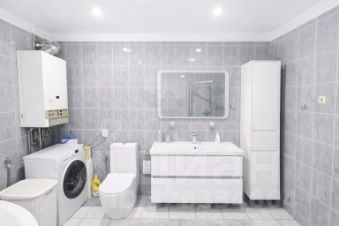 Просторный санузел с ванной выполнен в светлых тонах, функционален и удобен для ежедневного использования.