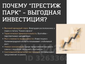 Апартаменты на побережье Балтийского моря. Хотите, чтобы ваши деньги работали, а вы отдыхали? Устали от типовых предложений, где всё как у всех? Тогда присмотритесь к Престиж Парк апарт комплексу, который меняет правила игры в инвестициях в недвижимость. В 2025 году комплекс получил награду CREDO, как Лучший апарт-комплекс в Калининградской области 2025. Мы не просто строим апартаменты, мы создаем ваш личный курорт и источник стабильного дохода. Почему именно Престиж Парк станет вашим лучшим финансовым решением? **Локация - 150 метров до Синего Флага:**Представьте: каждое утро пение чаек, свежий морской бриз и бескрайние просторы самого западного города России, Балтийска. Пляж здесь не просто широкий, а с потенциалом стать новым центром притяжения. Ваши апартаменты будут там, где другие мечтают провести отпуск! Инвестиционный потенциал: Благодаря уникальной локации, растущему туристическому потенциалу Балтийска и профессиональному доверительному управлению от УК Престиж Парк, ваши апартаменты будут востребованы круглый год. **Супер-низкая налоговая ставка:**В 2026 году всего 0,080% налога на имущество! Это означает, что ваша чистая прибыль будет расти быстрее, чем где-либо еще. 3. Планировки на любой вкус и бюджет: Апартаменты с высотой полотков до 3м **От уютных студий до просторных апартаментов с террасами:**Мы учли все от видовых апартаментов с панорамными видами на дендропарк до апартаментов с личными балконами, лоджиями и видом на море, дюны. Найдите свой идеальный вариант, который будет радовать вас и приносить максимальный доход. **Комфорт на новом уровне:**Электрические котлы и теплые водяные полы в каждом помещении забудьте о сквозняках и холодных полах. А на лоджии уже предусмотрено место для установки кондиционера! 4. Ваша Выгода Наша Забота: Гибкие рассрочки, которые мы подберем индивидуально для вас. **Передача ключей октябрь 2026 года.**Но уже сейчас вы можете приехать, увидеть завораживающие виды своими глазами и почувствовать атмосферу вашего будущего места у моря. Адрес, который вы запомните: ул. Чехова, Балтийск. Не упустите шанс инвестировать в недвижимость, которая растет в цене и приносит стабильный доход, пока вы наслаждаетесь жизнью у моря! Хотите узнать, какой апартамент принесет вам максимальную прибыль? **Нажмите Написать сообщение или позвоните прямо сейчас, чтобы получить индивидуальную консультацию и самые выгодные предложения! *стоимость в объявлениях указана с учетом скидки**