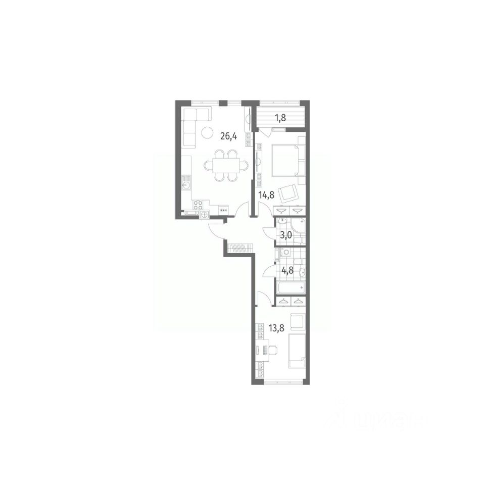 в Дом на Красной от компании ГК "ТРЕСТ". Площадь кухни 26.4 м². Жилой комплекс комфорт-класса "Дом на Красной" расположен в Центральном районе Калининграда на пересечении улиц Красная и Псковская. Жилой комплекс включает в себя два дома высотой 8 этажей. Срок сдачи намечен на 4 квартал 2026 года.