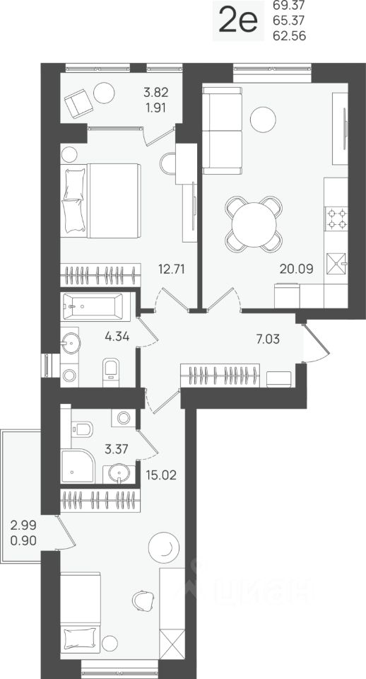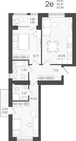 Продаётся 2-комнатная квартира в строящемся доме (Дом 3), срок сдачи: IV-кв. 2026, общей площадью 65.37 кв.м., на 2 этаже.