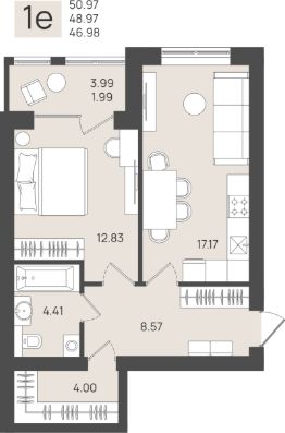 Продаётся 1-комнатная квартира в строящемся доме (Дом 3), срок сдачи: IV-кв. 2026, общей площадью 48.97 кв.м., на 2 этаже.